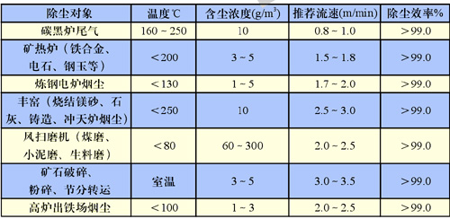 除尘器选用 LDML型及LDMM型除尘器属大中型除尘器,一般适用于炉窑烟气除尘,露天放置。 LDMS型除尘器属于小型除尘器,一般适用于矿石破碎、粉碎、筛分、转运过程的除尘,室外内放置。选型所根据的有关参数如下: 1、 过滤速度及除尘效率 过滤速度是除尘器选型的关键因素,应根据烟尘或粉尘的性质、应用场合、灰尘粒度、气体温度、含尘浓度等因素来确定。综合这些条件列出离线清灰脉冲袋式除尘器对几种烟尘和粉尘的适用过滤速度推荐值,见下表。