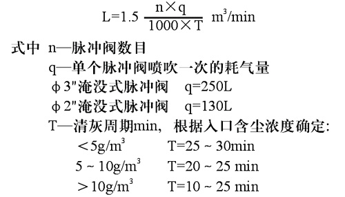 2、过滤材料 离线清灰脉冲袋式除尘采用针刺毯滤袋,当用户无特殊要求时,一般根据入品气体温度而使用以下材料。常温或<130℃时,500g/m2涤纶针刺毯. 130-250℃时,800g/m2纬双重织玻纤织物或800g/m2玻纤针刺毯、诺梅克斯针刺毯。 3、压缩空气耗量(L) 清灰用压缩空气耗量按下式计算: